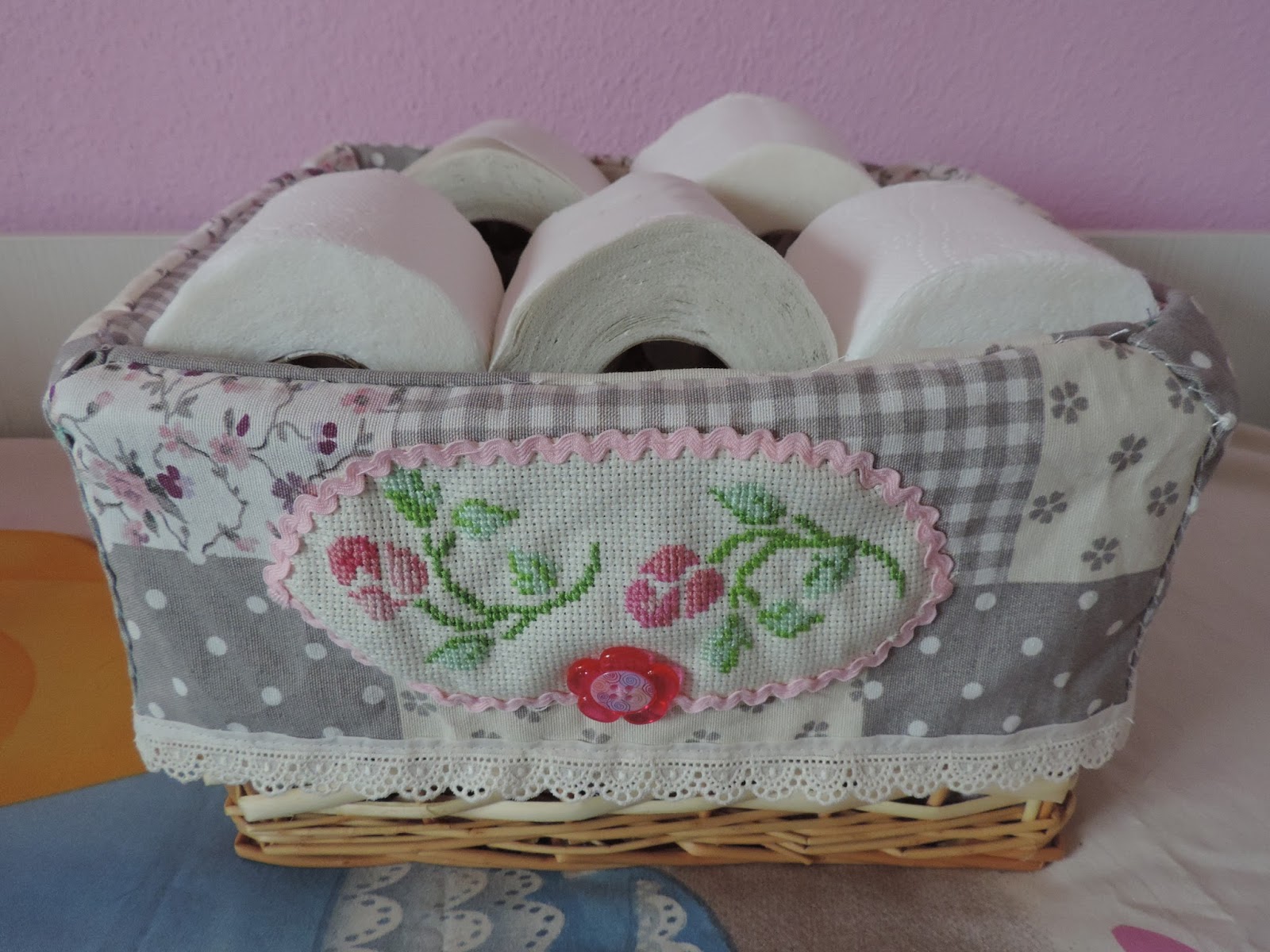 La forma de hacerlo es muy sencilla, he hecho un patrón de los lados de la cesta y los he cortado en tela, dándoles unos centímetros de más para coserlos y que quepan en la cesta., después le he cosido la puntilla de abajo y le he aplicado el bordado en punto de cruz, que había bordado en tela Aida. He bordado unas rosas porque si os fijais la tela tiene unos dibujos de rosas y también le he aplicado el botón en forma de flor, por el mismo motivo, porque en la tela hay flores con esa misma forma.